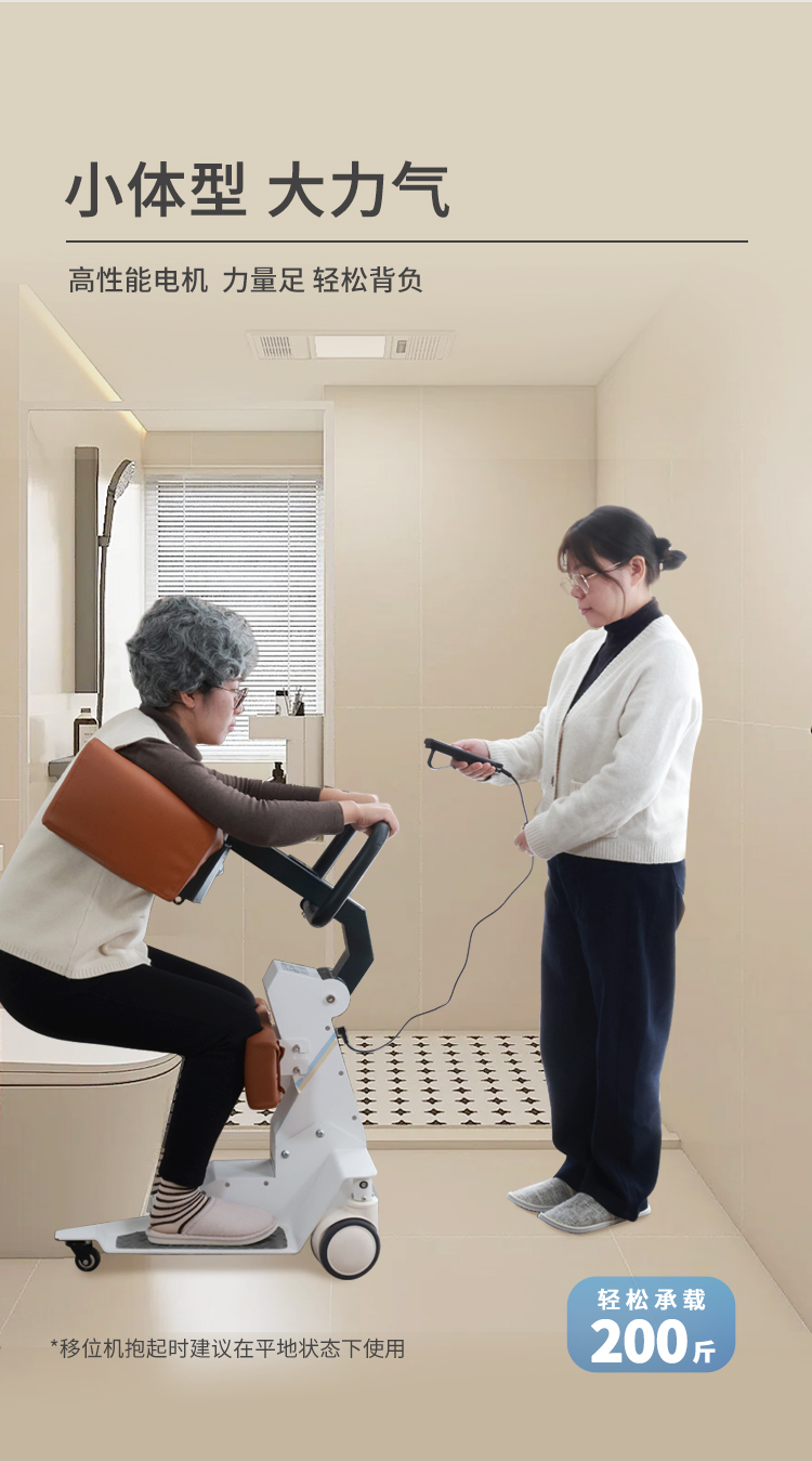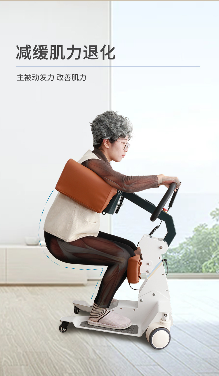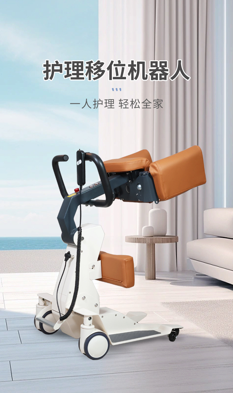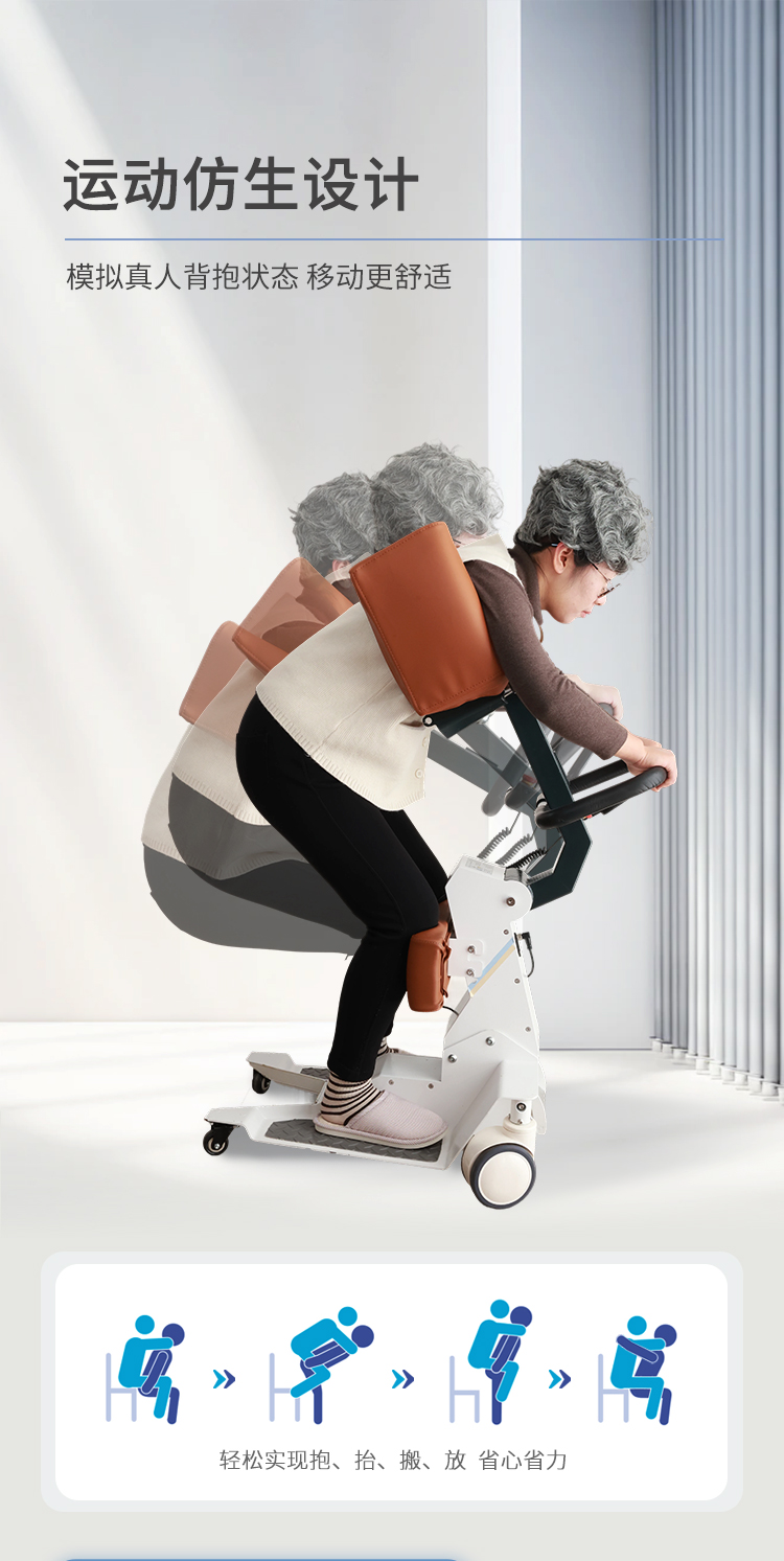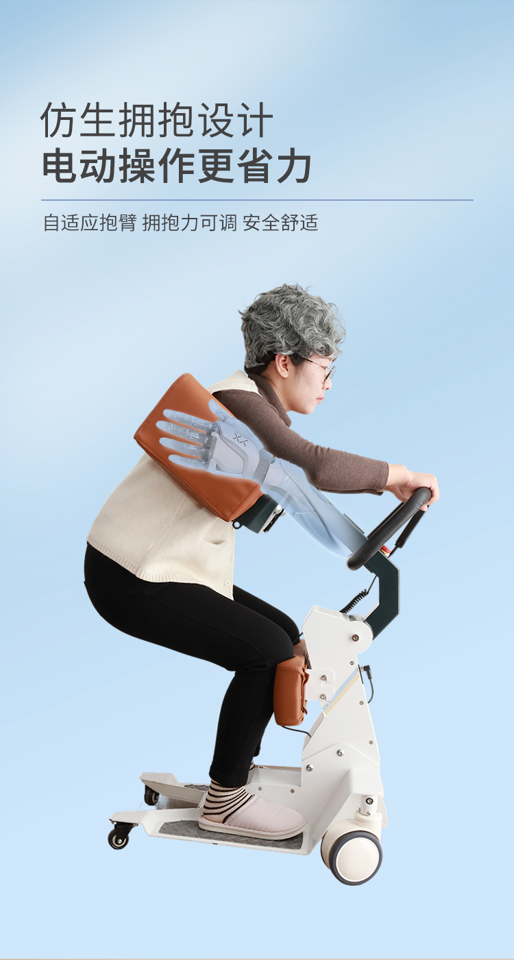 电动护理移位机采用拥抱式抱紧结构,模拟人工环抱方式将被转移人抱起、转运和抱落的一款电动移位设备。设备在运行过程中,通过胸靠、抱臂、膝靠贴紧被转移人,帮助腿脚不便、下肢失能人群轻松移位,比如上厕所、清洁、洗浴、用餐、出行等。 ·运动仿生设计,模拟真人背姿,移动更舒适 ·可手动折叠收纳,不占空间 ·低重心焊接式架构,安全不易侧翻