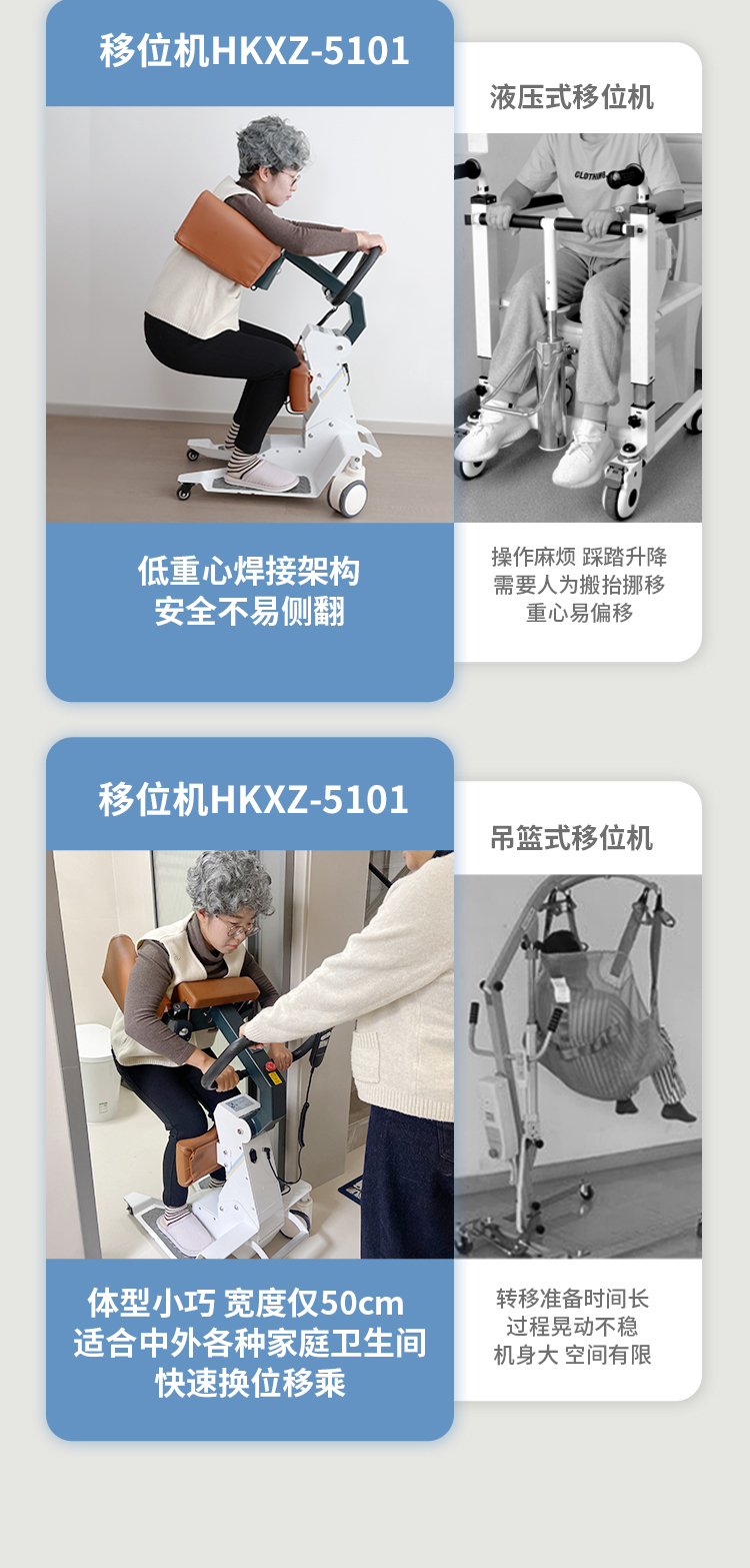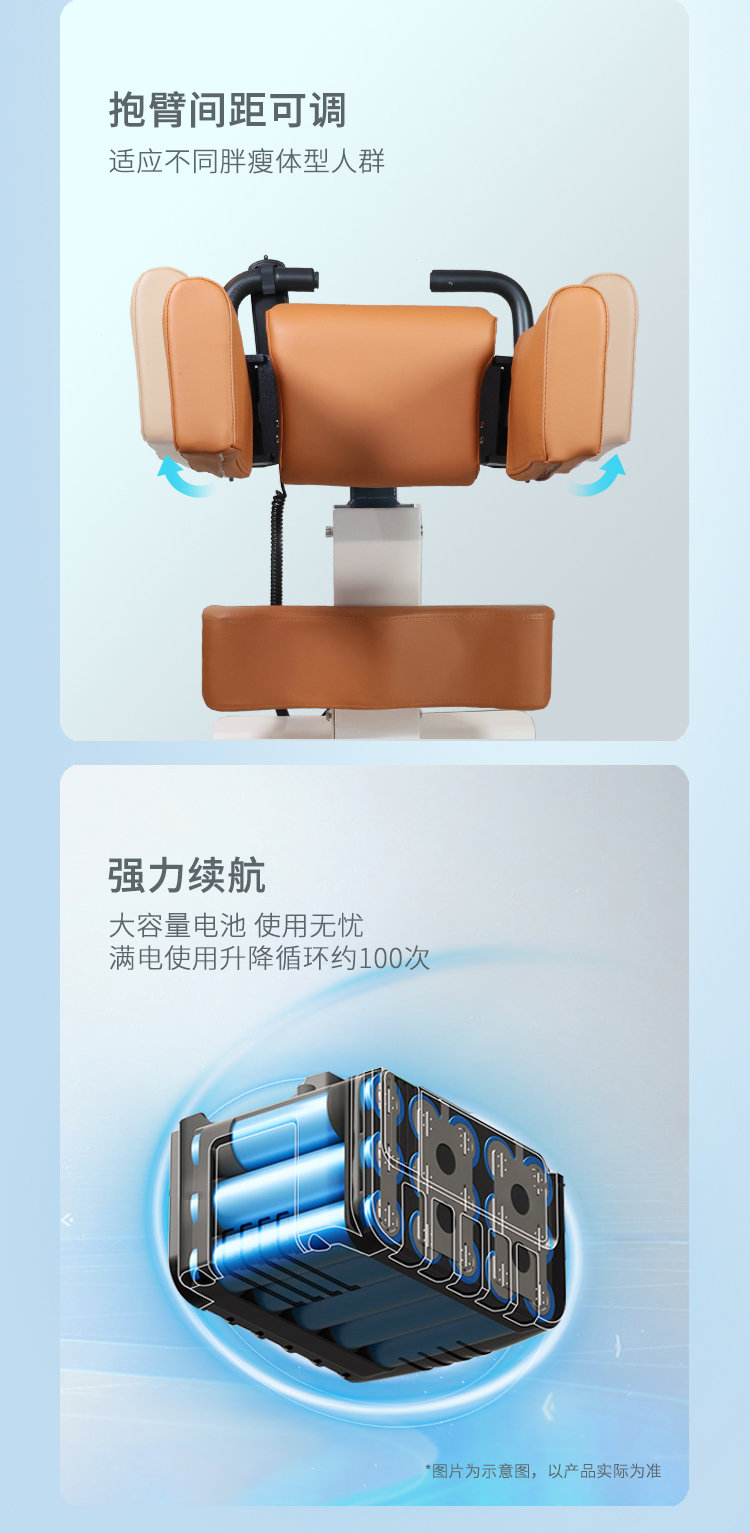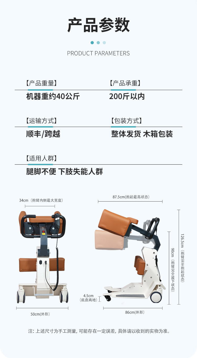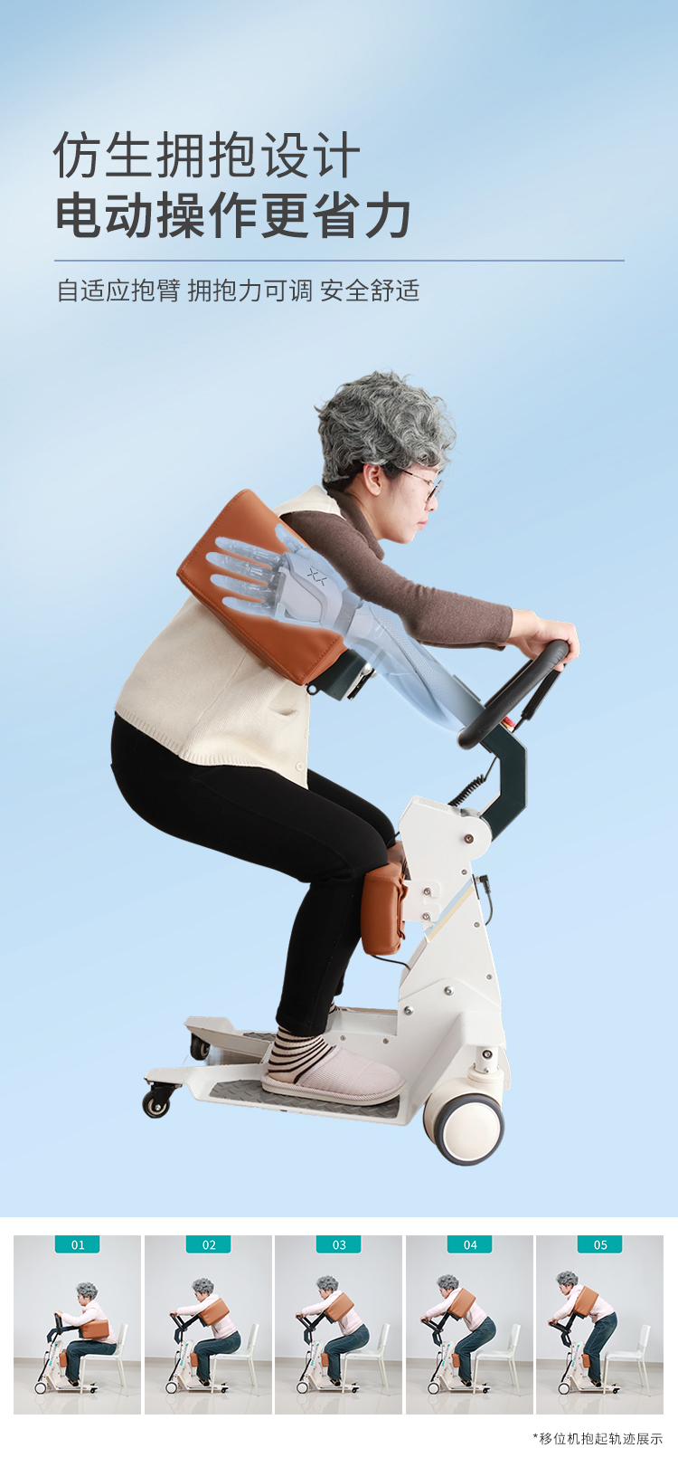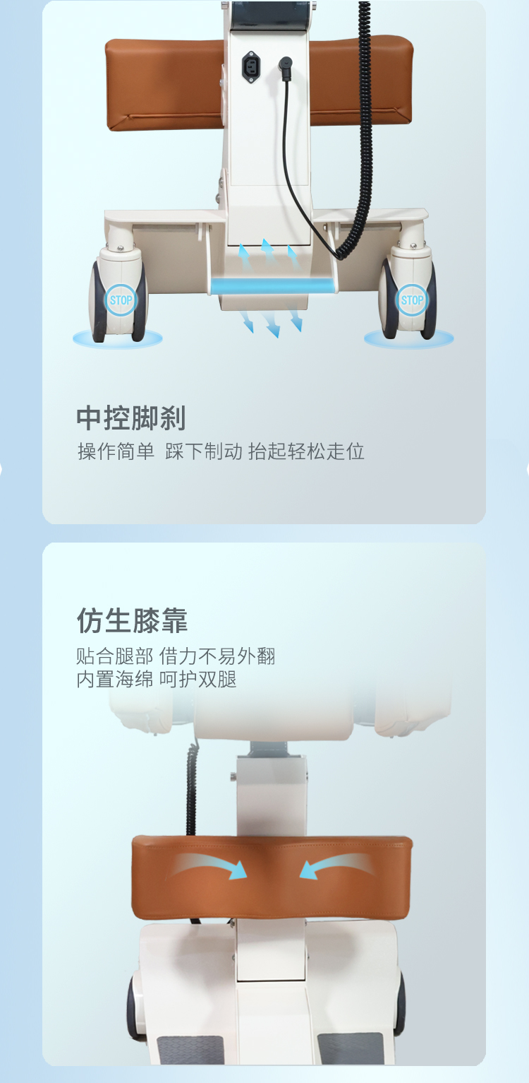 电动护理移位机采用拥抱式抱紧结构,模拟人工环抱方式将被转移人抱起、转运和抱落的一款电动移位设备。设备在运行过程中,通过胸靠、抱臂、膝靠贴紧被转移人,帮助腿脚不便、下肢失能人群轻松移位,比如上厕所、清洁、洗浴、用餐、出行等。 ·运动仿生设计,模拟真人背姿,移动更舒适 ·可手动折叠收纳,不占空间 ·低重心焊接式架构,安全不易侧翻