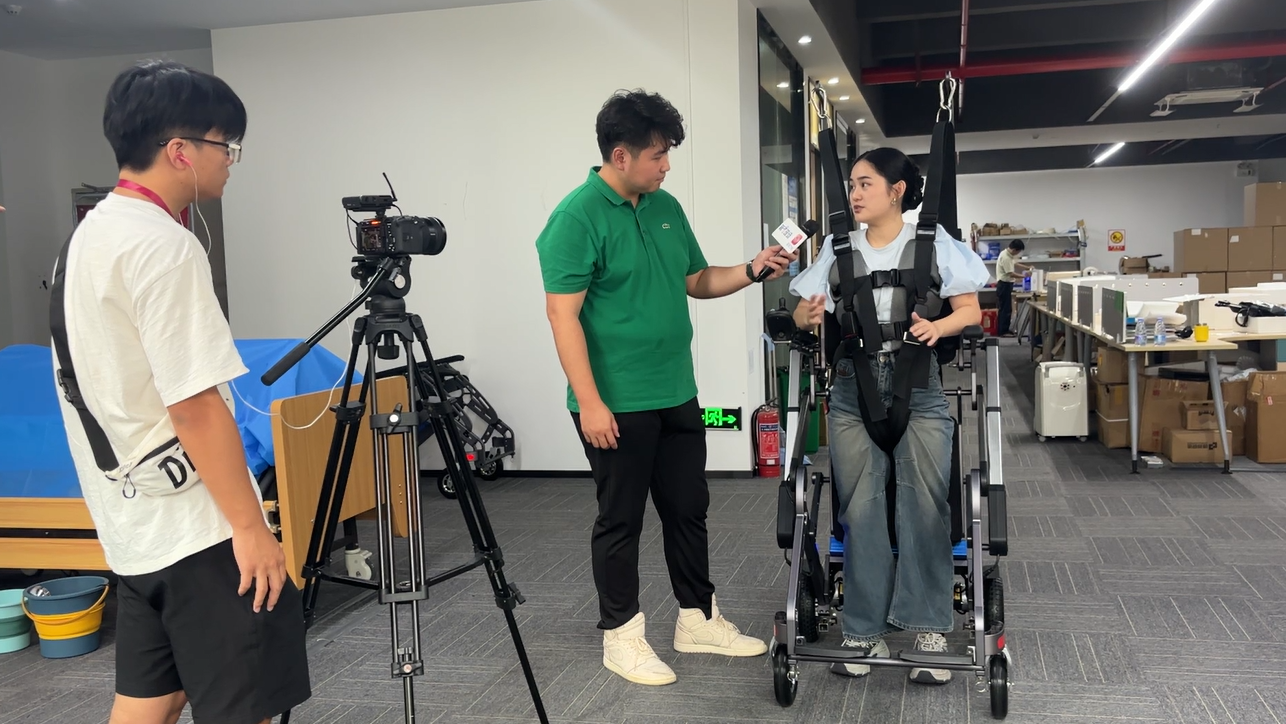 记者们深入了解了呵康科技自主研发的辅助行走机器人,其主要针对下肢行动障碍的患者,突破了传统康复的局限性,深度融合了减重步行训练(BWSTT)技术的精髓,通过电动控制吊带挂架的升降,同时带动减重吊带的升降,从而减轻患者下肢或腰部的承重量,为残疾人步行功能恢复提供了科学、高效的解决方案,具备多功能性、灵活性、实用性和有效性等创新特点,可让患者不受场地和时间限制自主训练,从而减轻家庭经济和人力负担、改善生活质量。