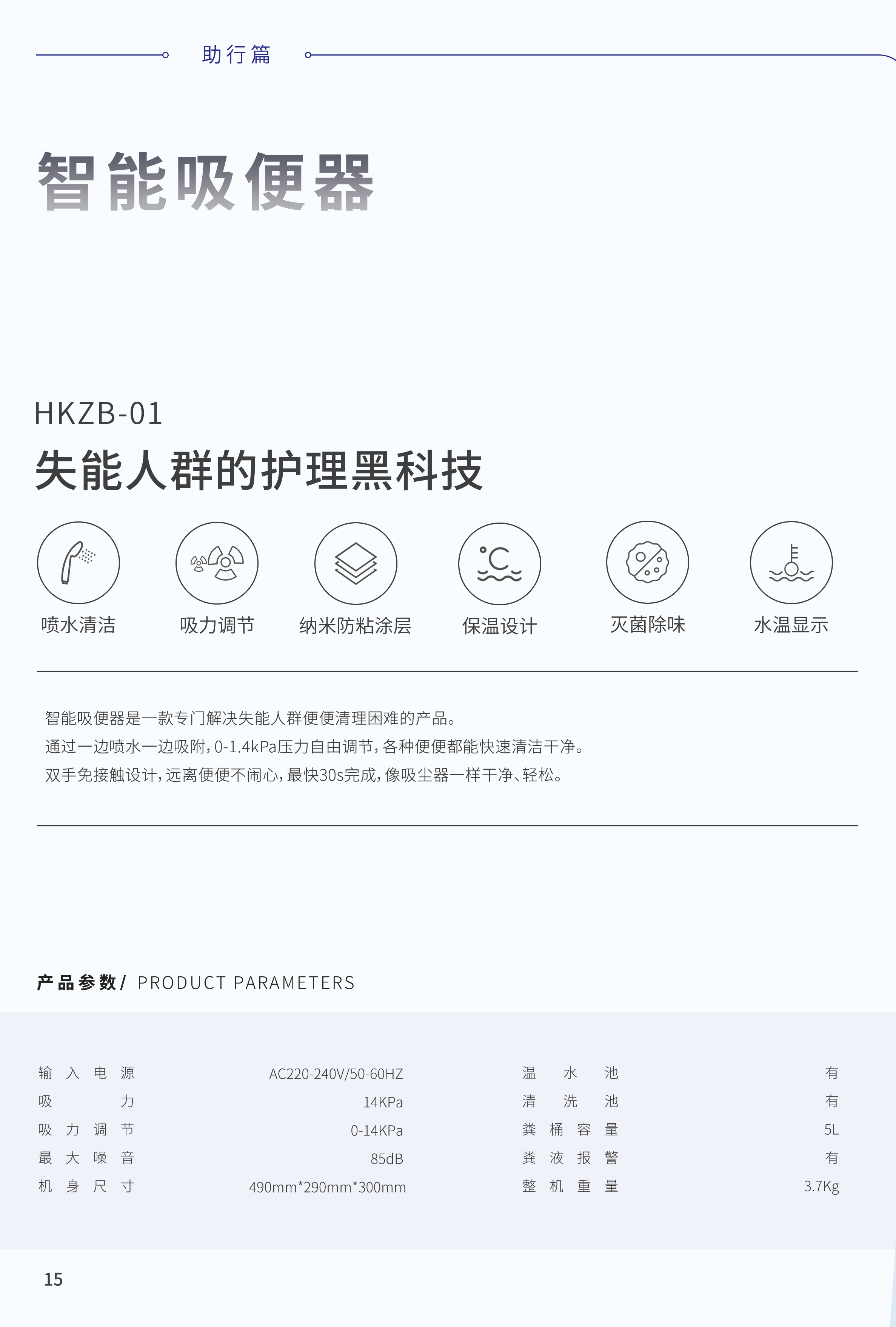 智能吸便器是一款专门解决失能人群便便清理困难的产品。通过一边喷水一边吸附,0-1.4kPa压力自由调节,各种便便都能快速清洁干净。双手免接触设计,远离便便不闹心,最快30s完成,像吸尘器一样干净、轻松。