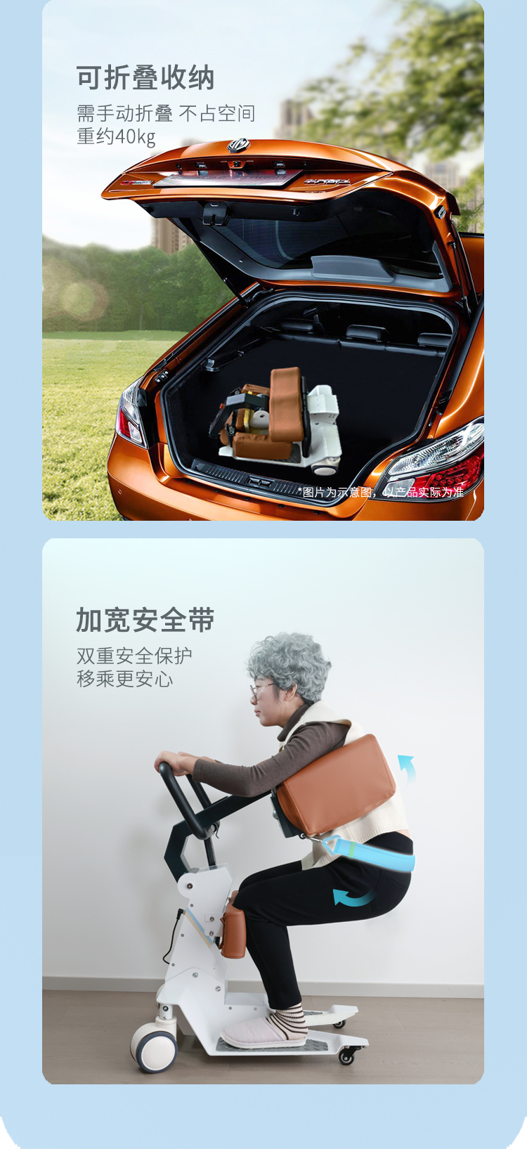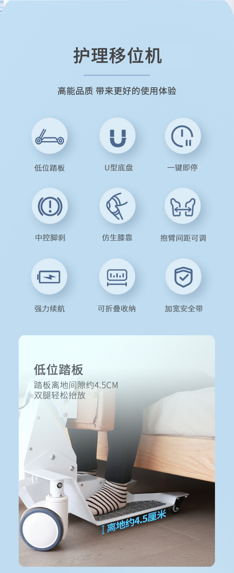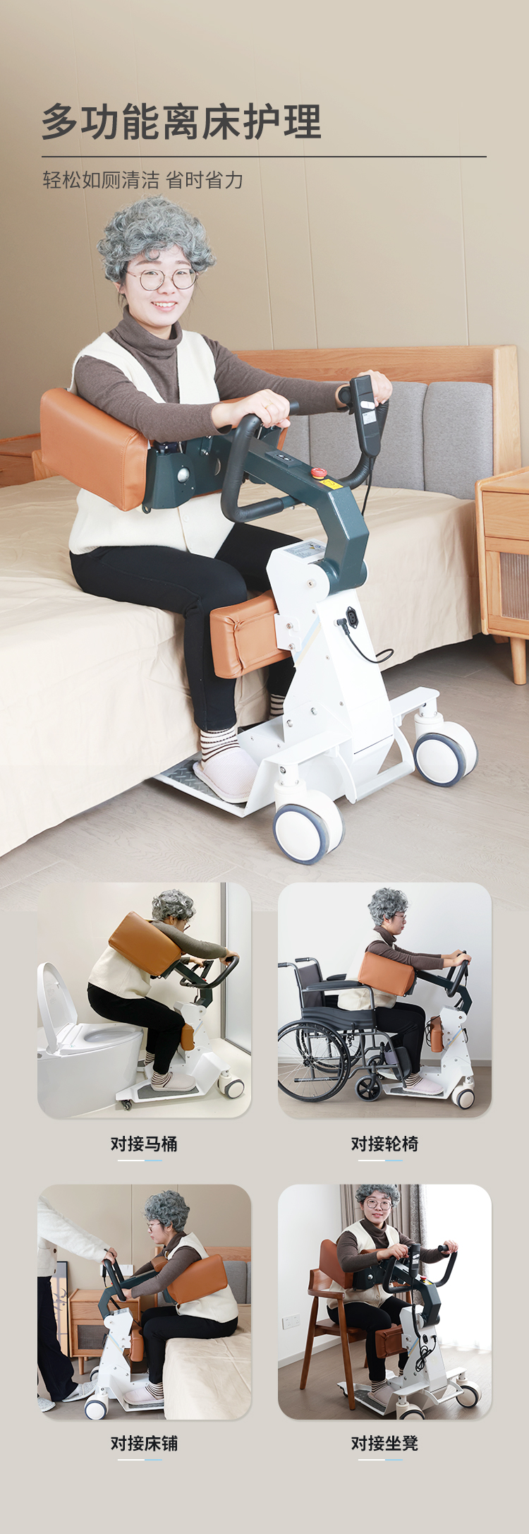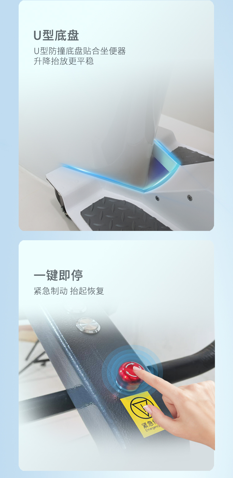 电动护理移位机采用拥抱式抱紧结构,模拟人工环抱方式将被转移人抱起、转运和抱落的一款电动移位设备。设备在运行过程中,通过胸靠、抱臂、膝靠贴紧被转移人,帮助腿脚不便、下肢失能人群轻松移位,比如上厕所、清洁、洗浴、用餐、出行等。 ·运动仿生设计,模拟真人背姿,移动更舒适 ·可手动折叠收纳,不占空间 ·低重心焊接式架构,安全不易侧翻
