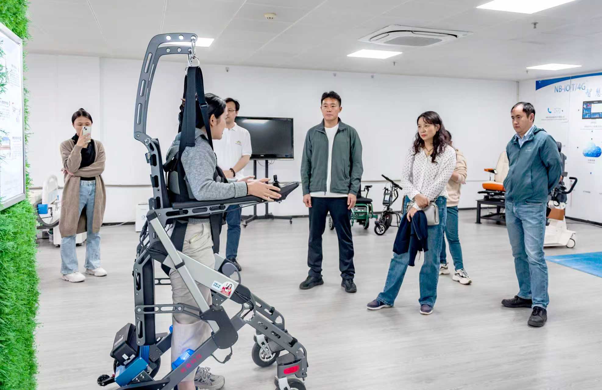 在考察过程中,呵康科技核心产品 —— 辅助行走机器人正式亮相。工作人员详细演示了机器人的核心功能,重点介绍了其在适配不同残障人士需求、提升出行安全性与便利性方面的设计亮点。